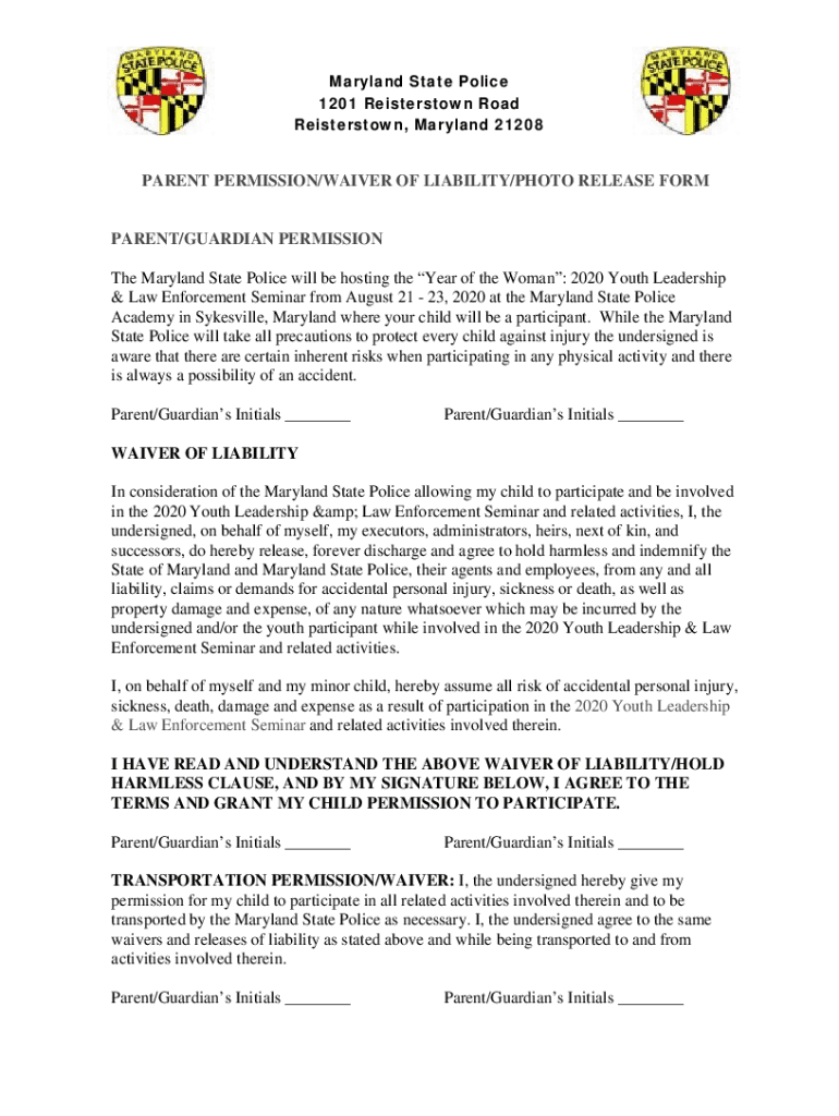 Maryland State Police 1201 Reisterstown Road Reisterstown, Maryland 21208PARENT PERMISSION/WAIVER OF LIABILITY/PHOTO RELEASE FIRMAMENT/GUARDIAN PERMISSION The Maryland State Police will be hosting