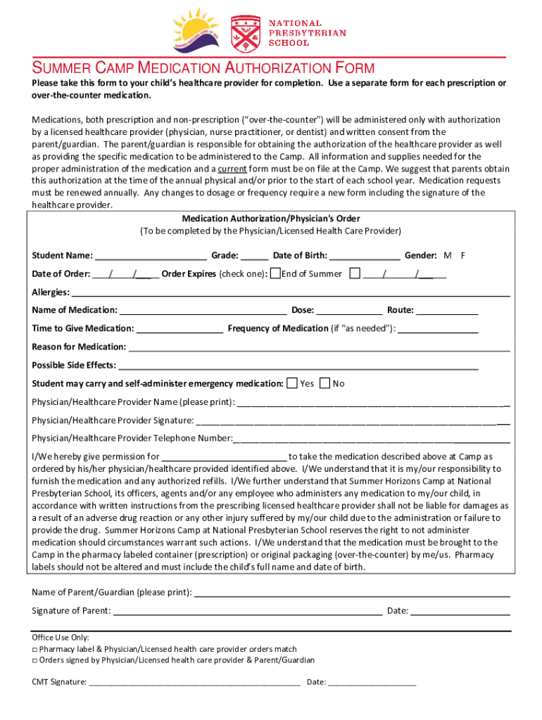SUMMER CAMP MEDICATION AUTHORIZATION FORM Please take this form to your children healthcare provider for completion. Use a separate form for each prescription or overthecounter medication. Medications,