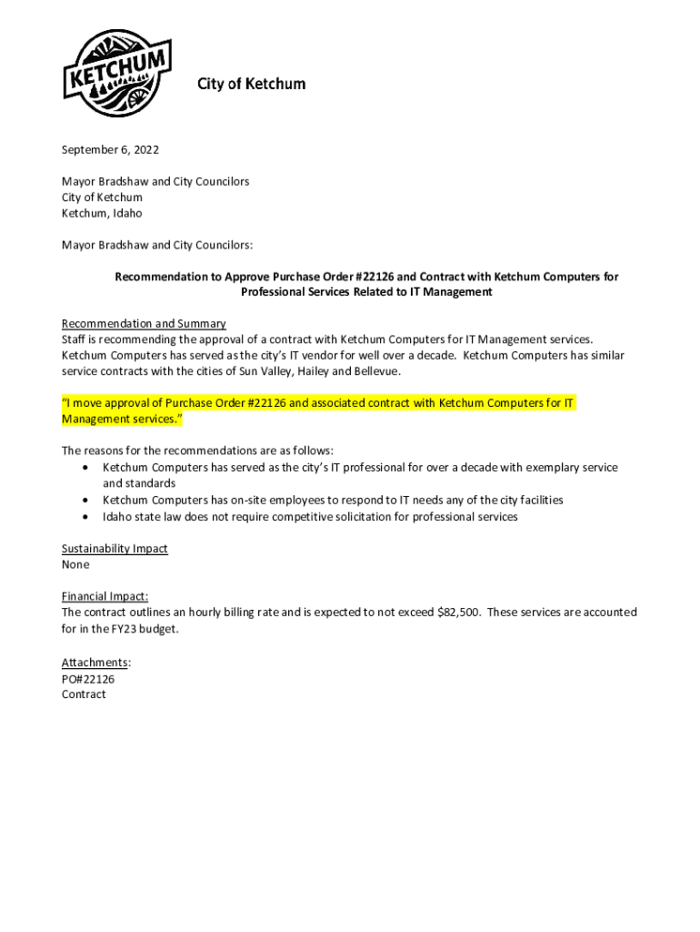 September 6, 2022, Mayor Bradshaw and City Councilors City of Ketchup, Idaho Mayor Bradshaw and City Councilors: Recommendation to Approve Purchase Order #22126 and Contract with Ketchup Computers