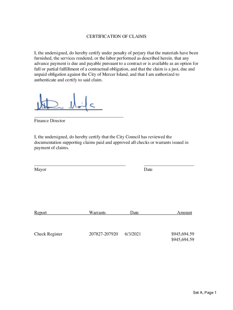 CERTIFICATION OF CLAIMS, the undersigned, do hereby certify under penalty of perjury that the materials have been furnished, the services rendered, or the labor performed as described herein, that