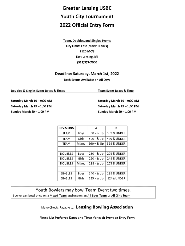Greater Lansing USB Youth City Tournament 2022 Official Entry Form Team, Doubles, and Singles Events City Limits East (Marvel Lanes) 2120 M78 East Lansing, MI (517)3777000Deadline: Saturday, March