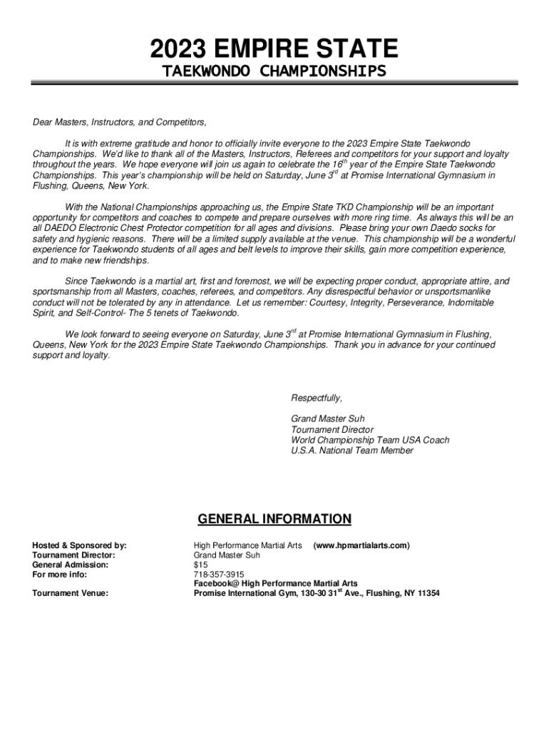 2023 EMPIRE STATE TAEKWONDO CHAMPIONSHIPS Dear Masters, Instructors, and Competitors, It is with extreme gratitude and honor to officially invite everyone to the 2023 Empire State Taekwondo Championships.