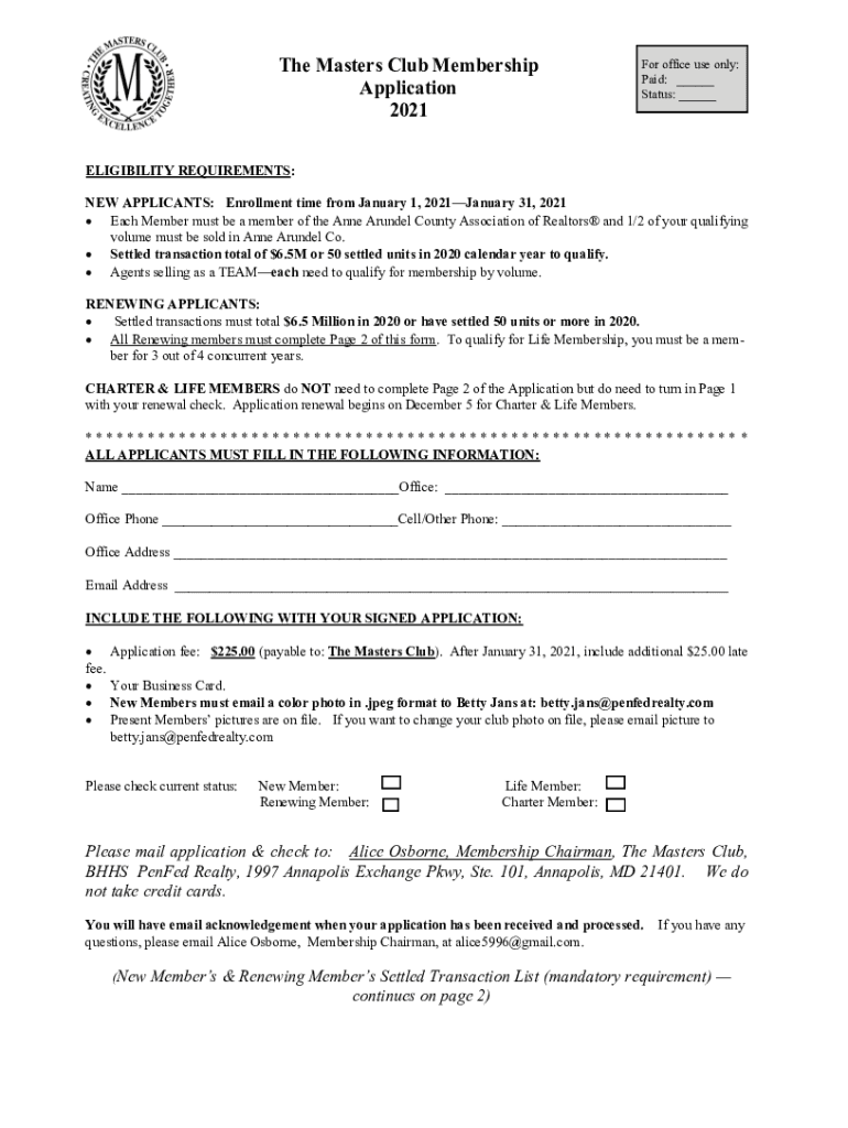 The Masters Club Membership Application 2021For office use only: Paid: ___ Status: ___ELIGIBILITY REQUIREMENTS: NEW APPLICANTS: Enrollment time from January 1, 2021January 31, 2021 Each Member must