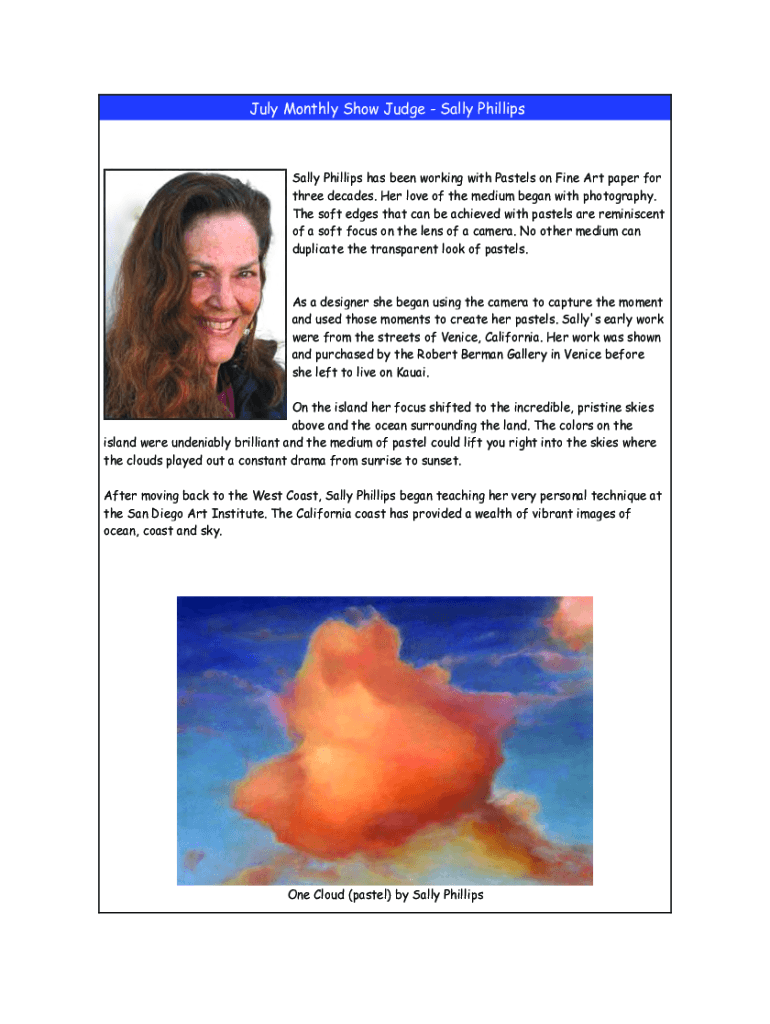 July Monthly Show Judge Sally Phillips has been working with Pastels on Fine Art paper for three decades. Her love of the medium began with photography. The soft edges that can be achieved with pastels