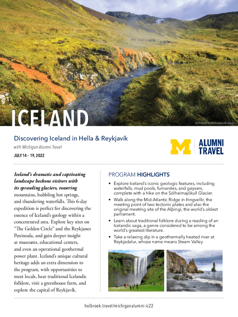 Iceland River in Reykjadalur ValleyDiscovering Iceland in Hello & Reykjavík with Michigan Alumni Travel July 14 19, 2022Icelands dramatic and captivating landscape beckons visitors with its sprawling