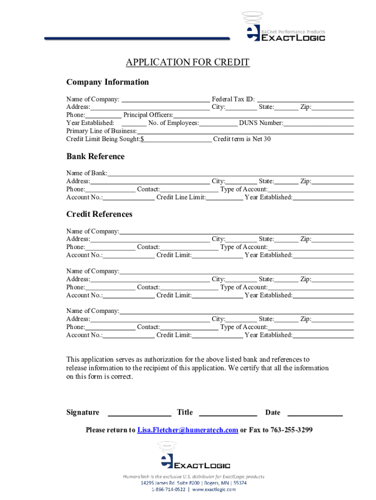 APPLICATION FOR CREDIT Company Information Name of Company: Address: Phone: Principal Officers: Year Established: No. of Employees: Primary Line of Business: Credit Limit Being Sought:federal Tax