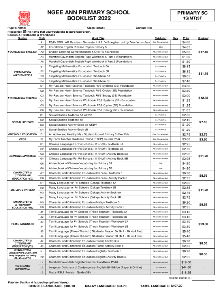NEE ANN PRIMARY SCHOOL BOOKLET 2022 Pupil\'s Name:___ Class (2022):___ Please tick R the items that you would like to purchase/order. Section A: Textbooks & Workbooks SubjectCodePRIMARY 5C 1S(MT)3F