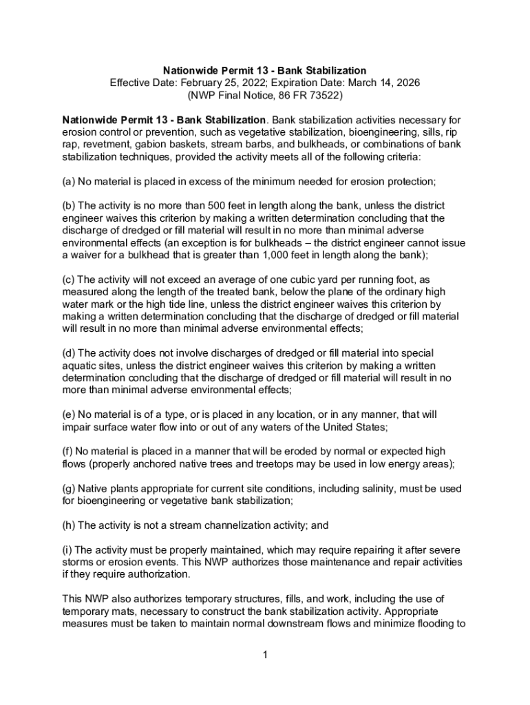 Nationwide Permit 13 Bank Stabilization Effective Date: February 25, 2022; Expiration Date: March 14, 2026 (NP Final Notice, 86 FR 73522) Nationwide Permit 13 Bank Stabilization. Bank stabilization