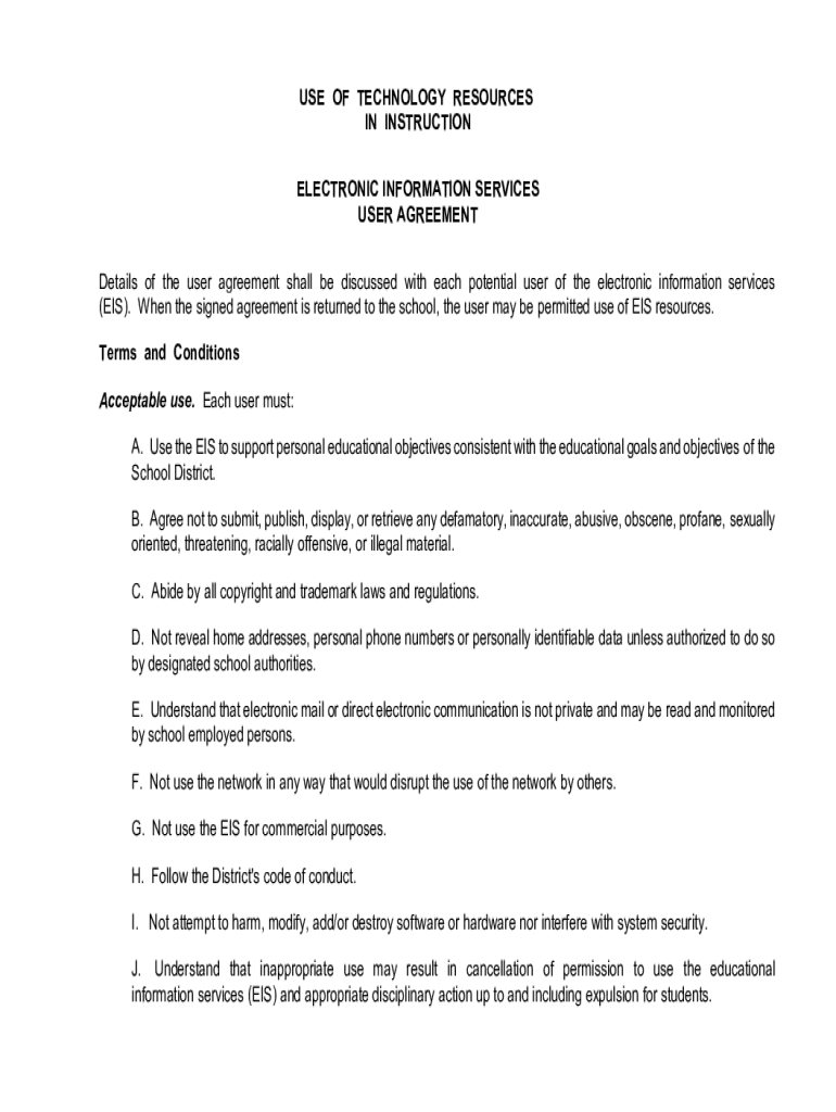 USE OF TECHNOLOGY RESOURCES IN INSTRUCTION ELECTRONIC INFORMATION SERVICES USER AGREEMENT Details of the user agreement shall be discussed with each potential user of the electronic information services