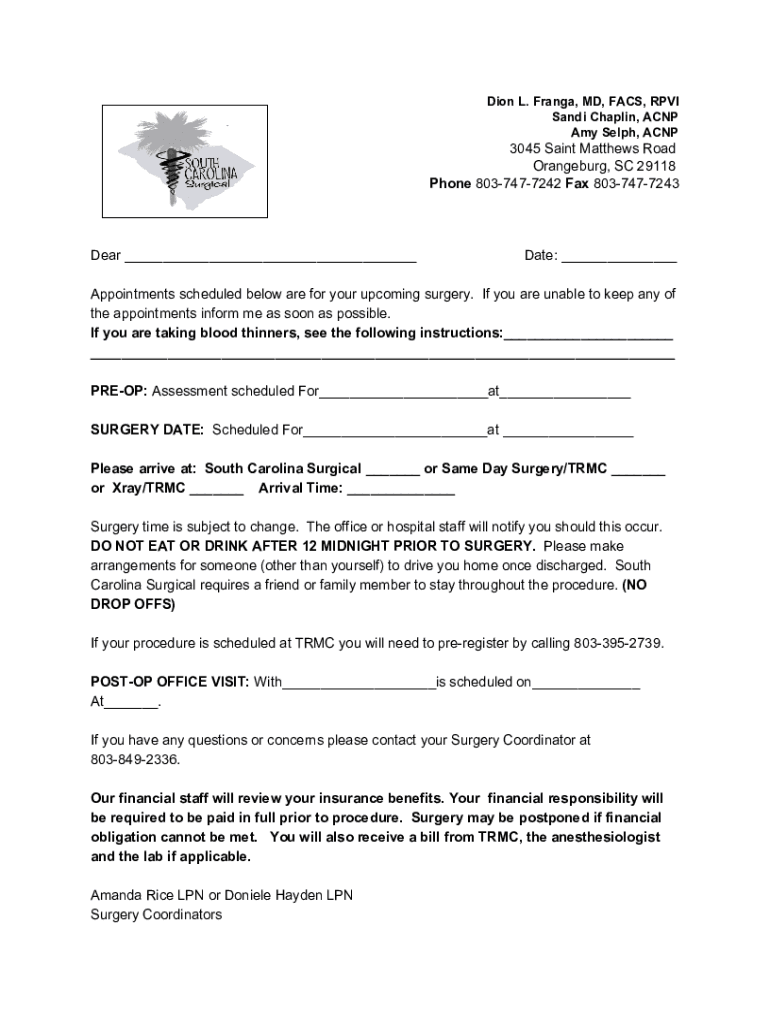 Dion L. Range, MD, FACS, RPI Sand Chaplin, ACNE Amy Self, ACNP3045 Saint Matthews Road Orange burg, SC 29118 hone 8037477242 Fax 8037477243 Pair ___Date: ___Appointments scheduled below are for your