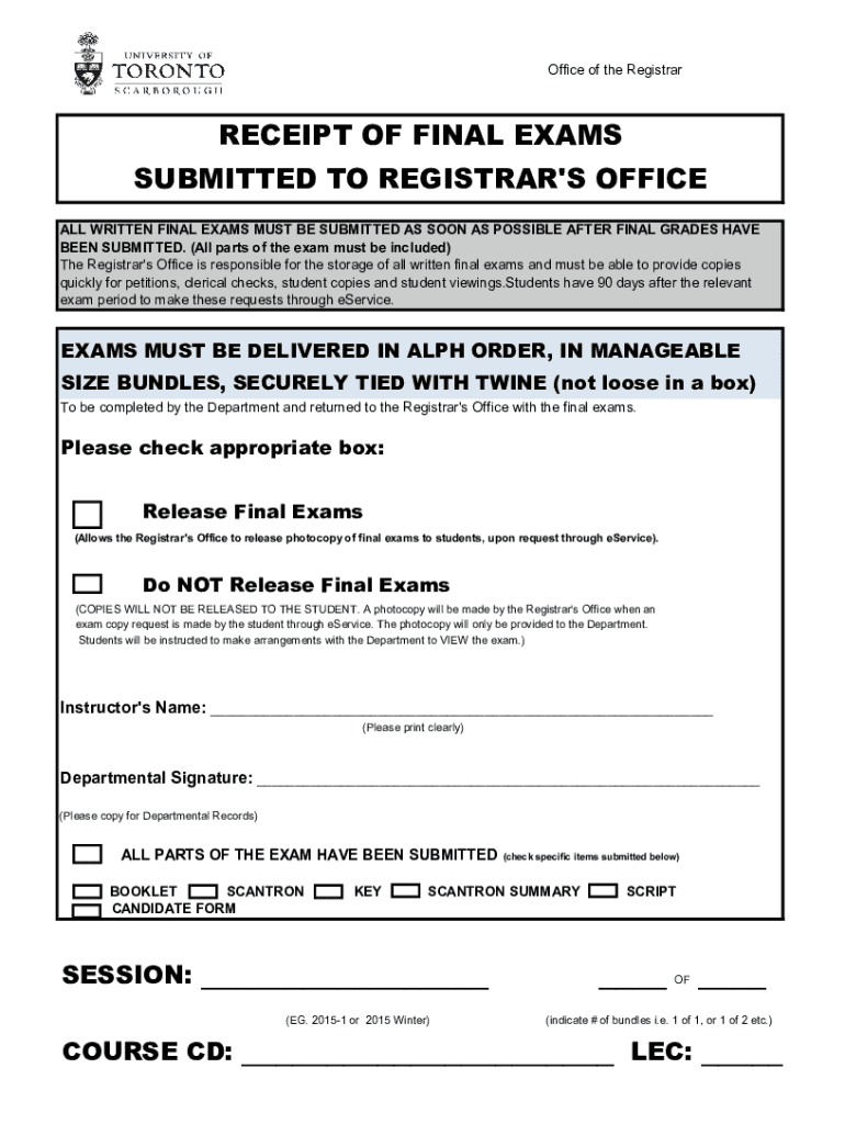 Office of the RegistrarRECEIPT OF FINAL EXAMS SUBMITTED TO REGISTRAR\'S OFFICE ALL WRITTEN FINAL EXAMS MUST BE SUBMITTED AS SOON AS POSSIBLE AFTER FINAL GRADES HAVE BEEN SUBMITTED. (All parts of the
