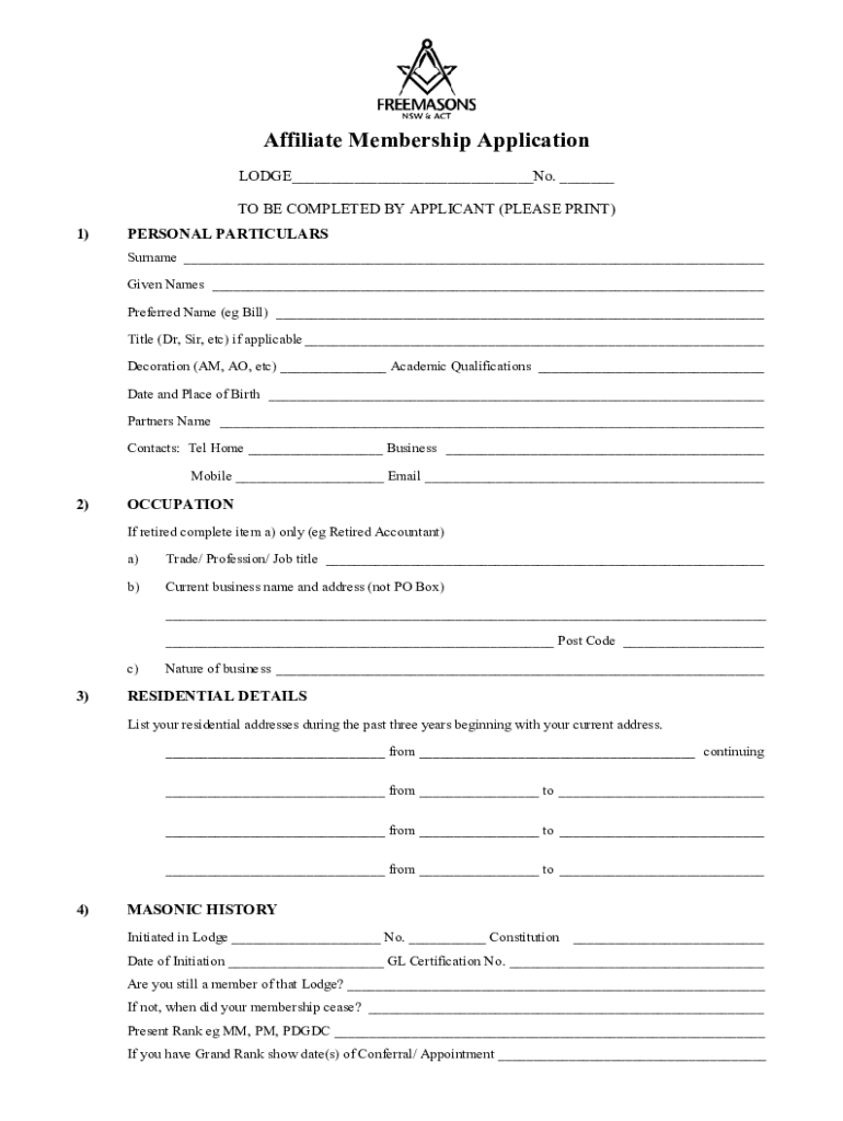 Affiliate Membership Application LODGE___No. ___ TO BE COMPLETED BY APPLICANT (PLEASE PRINT) 1)PERSONAL PARTICULARS Surname ___ Given Names ___ Preferred Name (e.g. Bill) ___ Title (Dr, Sir, etc)