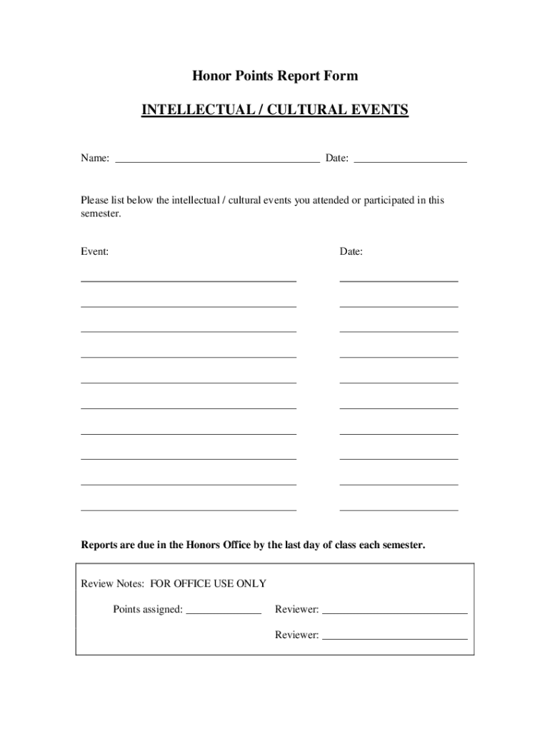 Honor Points Report Form INTELLECTUAL / CULTURAL EVENTS Name: ___ Date: ___Please list below the intellectual / cultural events you attended or participated in this semester. Event:Date:____________________________________________________________Reports