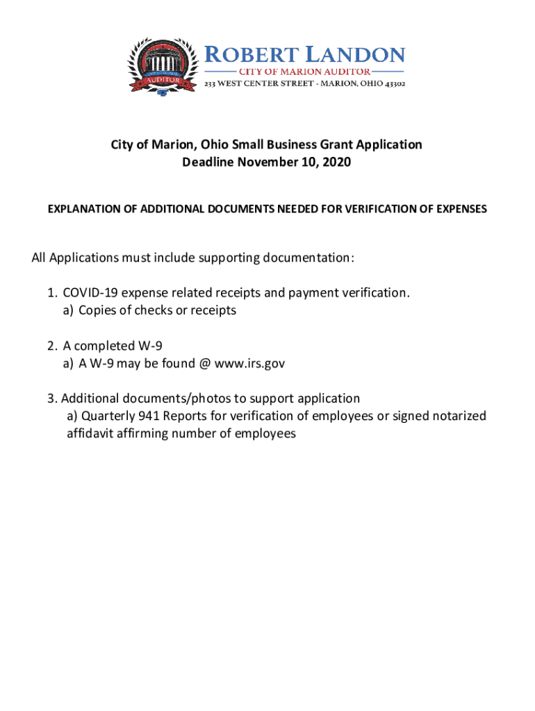 City of Marion, Ohio Small Business Grant Application Deadline November 10, 2020, EXPLANATION OF ADDITIONAL DOCUMENTS NEEDED FOR VERIFICATION OF Expenses Applications must include supporting documentation: