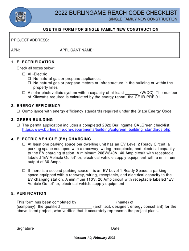 2022 BURLINGTON REACH CODE CHECKLIST SINGLE FAMILY NEW CONSTRUCTION USE THIS FORM FOR SINGLE FAMILY NEW CONSTRUCTION PROJECT ADDRESS:___ APN:___ APPLICANT NAME:___ 1. ELECTRIFICATION Checks all boxes