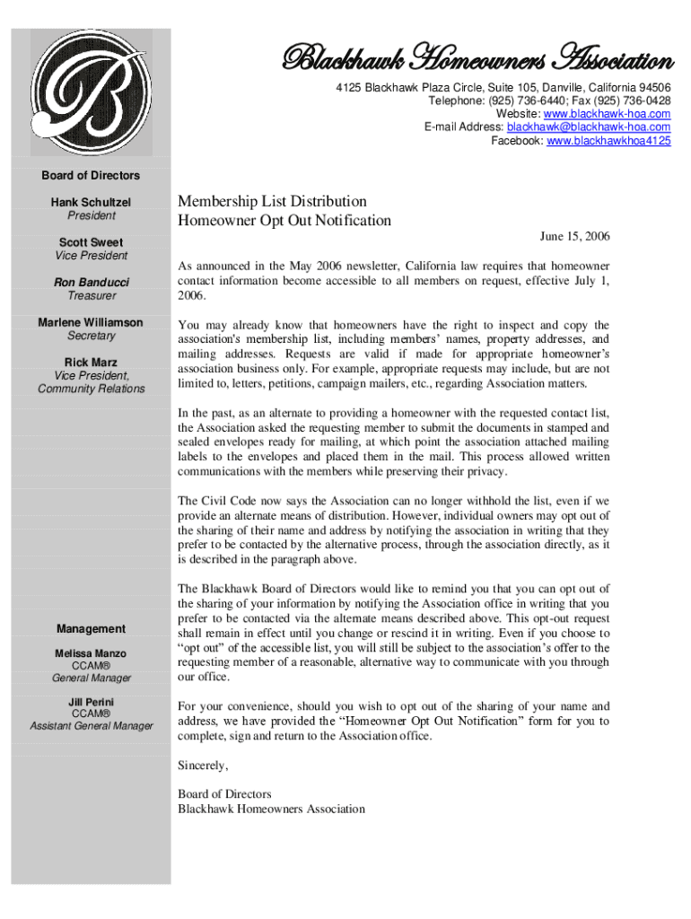 Black hawk Homeowners Association 4125 Black hawk Plaza Circle, Suite 105, Danville, California 94506 Telephone: (925) 7366440; Fax (925) 7360428 Website: www.blackhawkhoa.com Email Address: blackhawk@blackhawkhoa.com