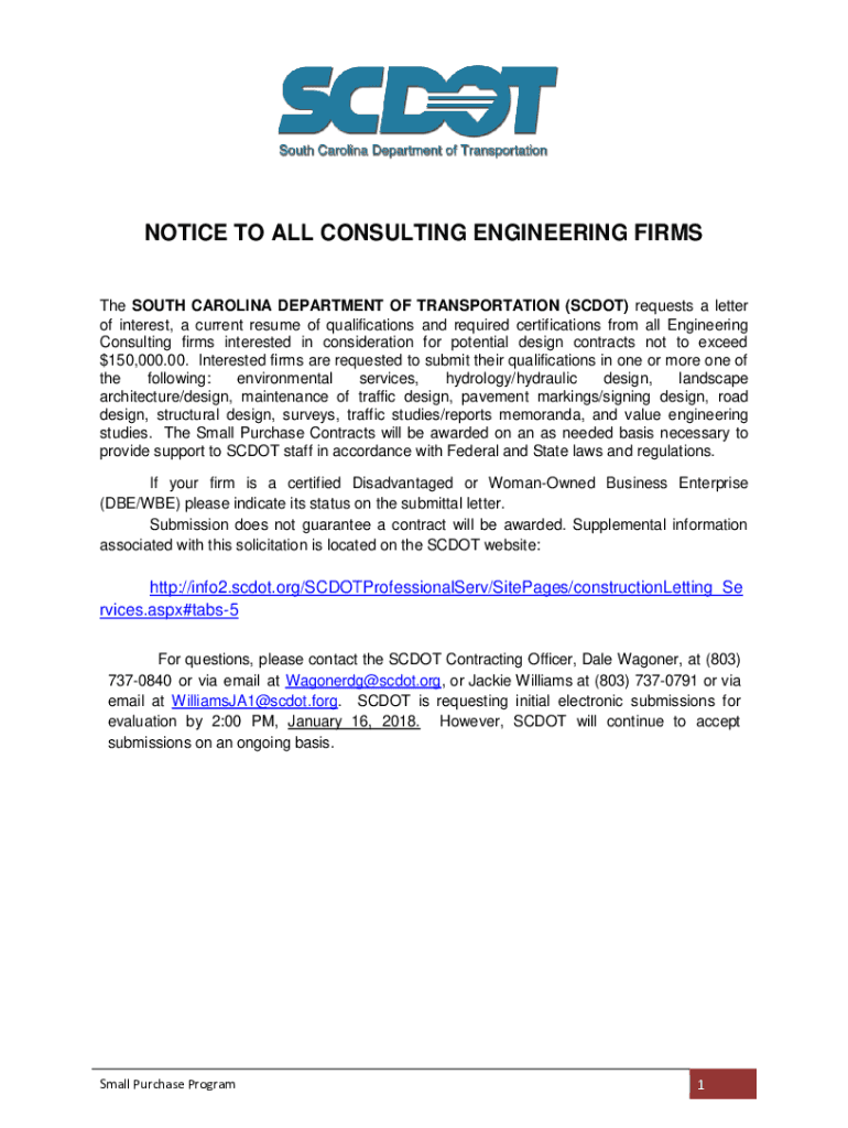 NOTICE TO ALL CONSULTING ENGINEERING FIRMS The SOUTH CAROLINA DEPARTMENT OF TRANSPORTATION (SCOT) requests a letter of interest, a current resume of qualifications and required certifications from