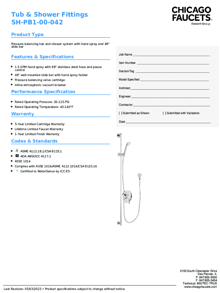 Tub & Shower Fittings SHPB100042 Product Type Pressure balancing tub and shower system with hand spray and 48\” slide features & Specifications Job Name ___ Item Number ___1.5 GPM hand spray with