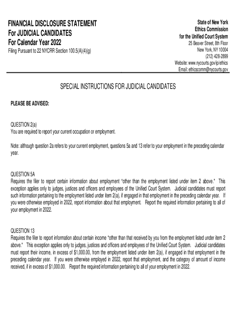 FINANCIAL DISCLOSURE STATEMENT For JUDICIAL CANDIDATES For Calendar Year 2022 Filing Pursuant to 22 NY CRR Section 100.5(A)(4)(g)State of New York Ethics Commission for the Unified Court System 25