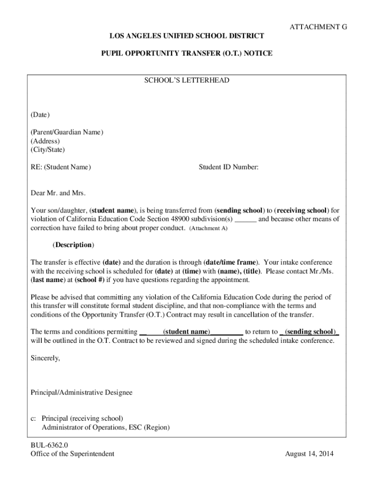 ATTACHMENT G LOS ANGELES UNIFIED SCHOOL DISTRICT PUPIL OPPORTUNITY TRANSFER (O.T.) NOTICESCHOOLS LETTERHEAD(Date) (Parent/Guardian Name) (Address) (City/State) RE: (Student Name)Student ID Number:Dear