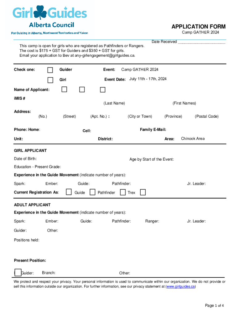 APPLICATION FORM Camp GATHER 2024This camp is open for girls who are registered as Pathfinders or Rangers. The cost is $175 + GST for Guiders and $350 + GST for girls. Email your application to Be