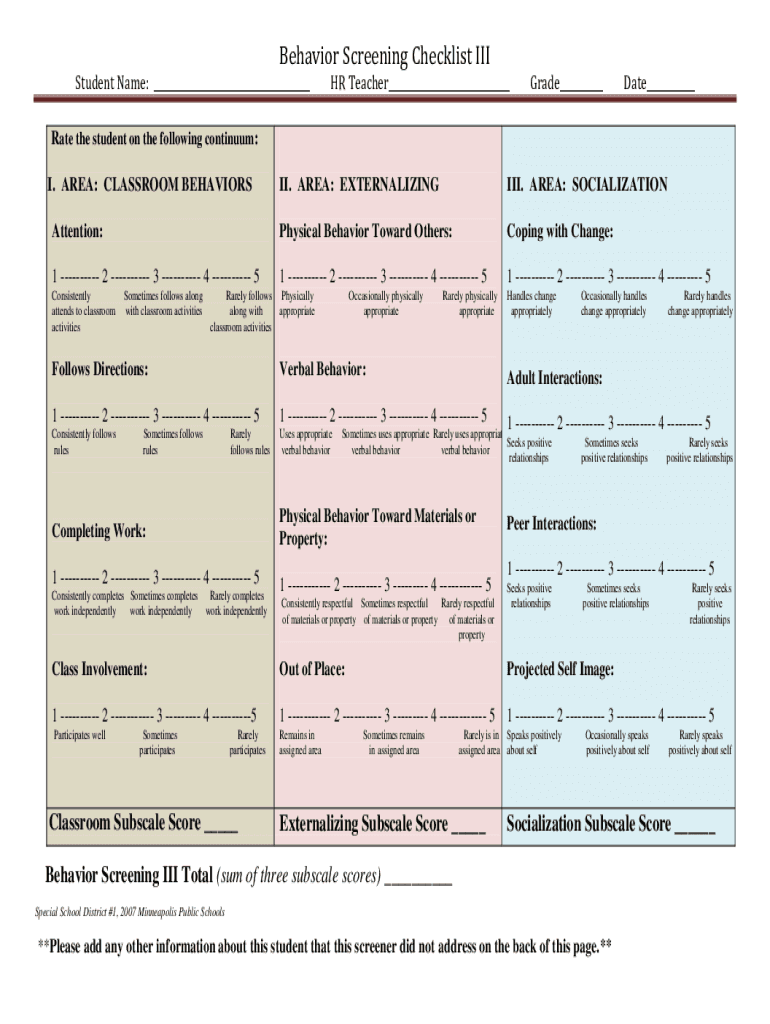 Behavior screening checklist iii is typically filled out by selecting appropriate responses to a series of questions regarding behavior and emotional characteristics.