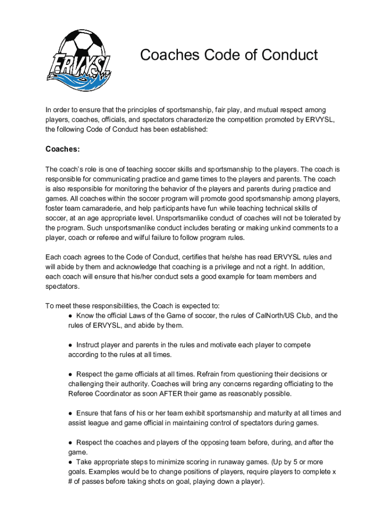 Coaches Code of Conducting order to ensure that the principles of sportsmanship, fair play, and mutual respect among players, coaches, officials, and spectators characterize the competition promoted