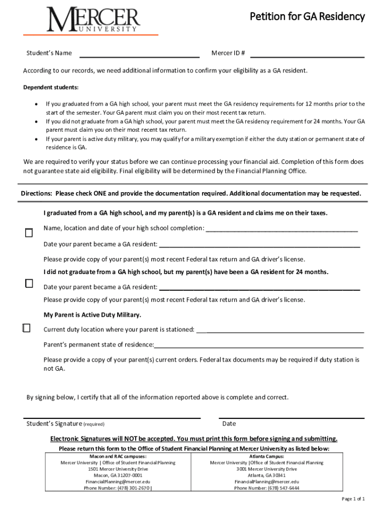 Petition for GA Residency Students Name Mercer ID #According to our records, we need additional information to confirm your eligibility as a GA resident. Dependent students: If you graduated from