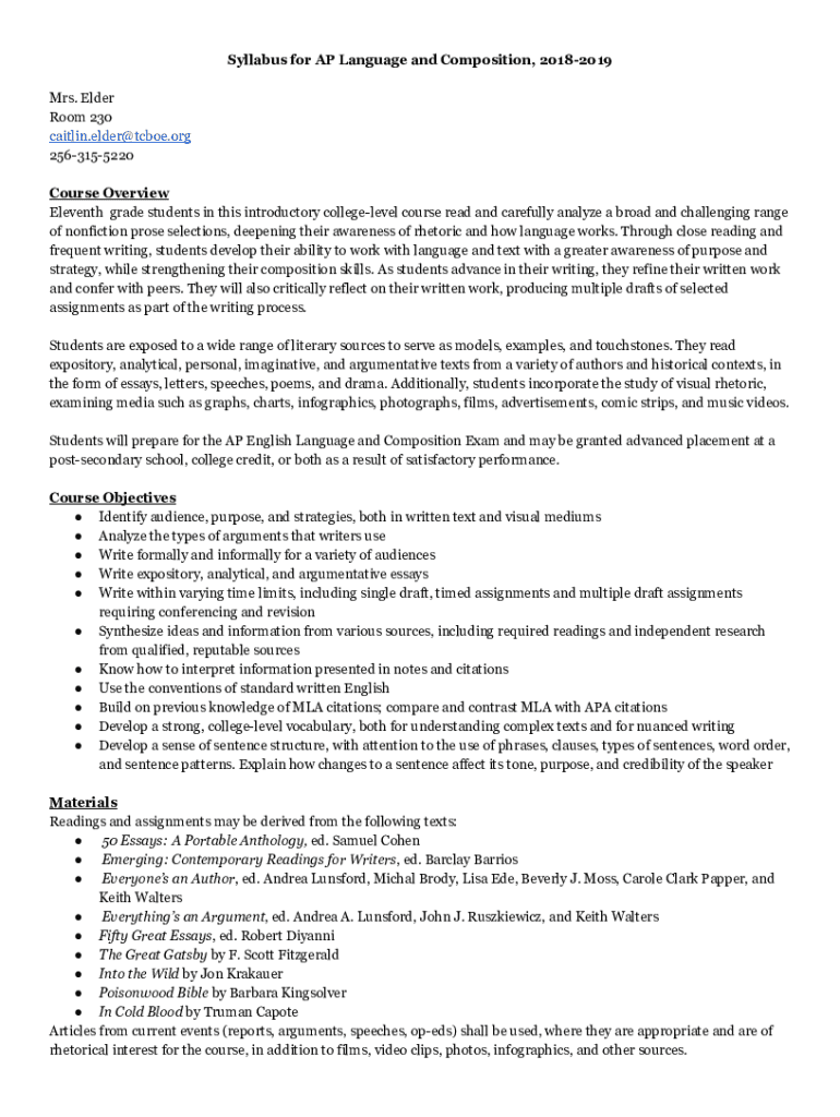 Syllabus for AP Language and Composition, 20182019 Mrs. Elder Room 230 caitlin.elder@tcboe.org 2563155220 Course Overview Eleventh grade students in this introductory college level course read and