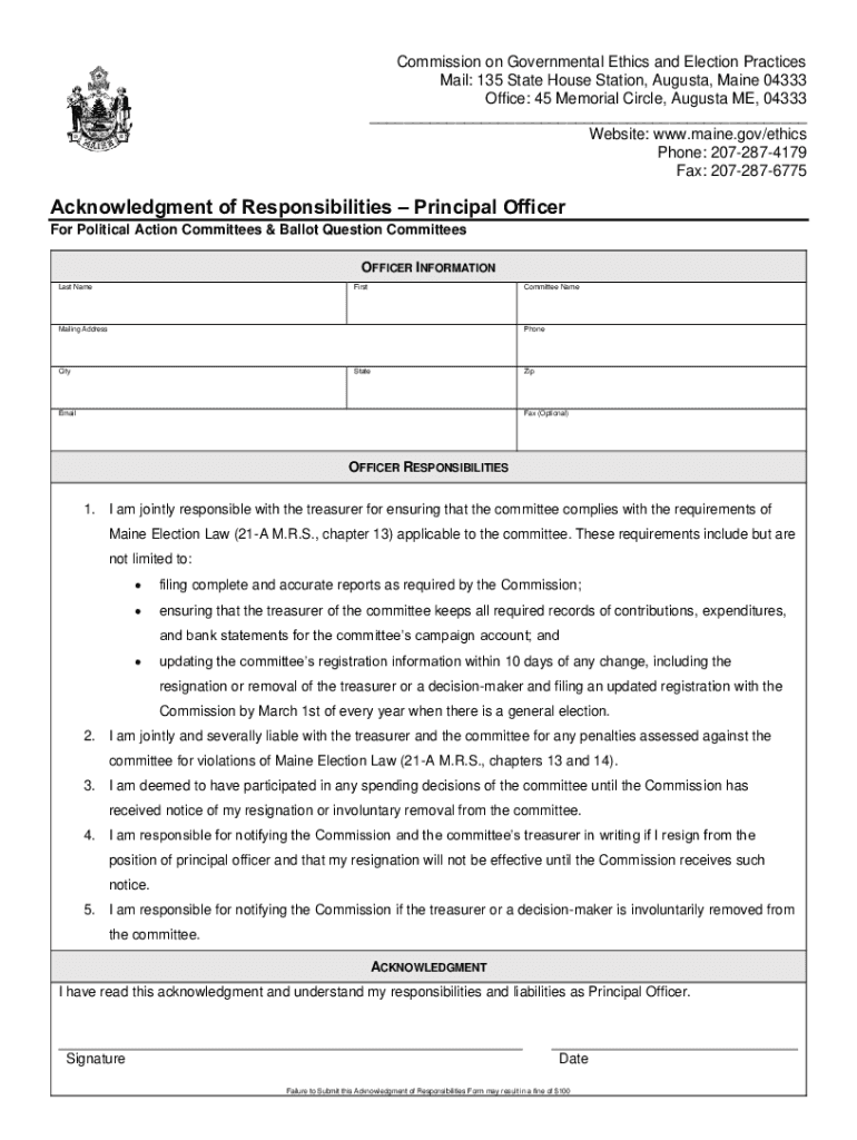Get the free Acknowledgment of Responsibilities Principal Officer