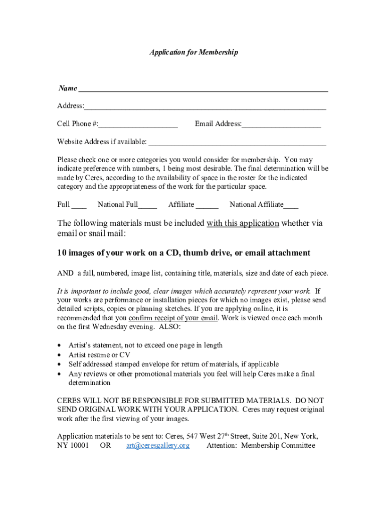 Application for MembershipName ___ Address:___ Cell Phone #:___Email Address:___Website Address if available: ___ Please check one or more categories you would consider for membership. You may indicate