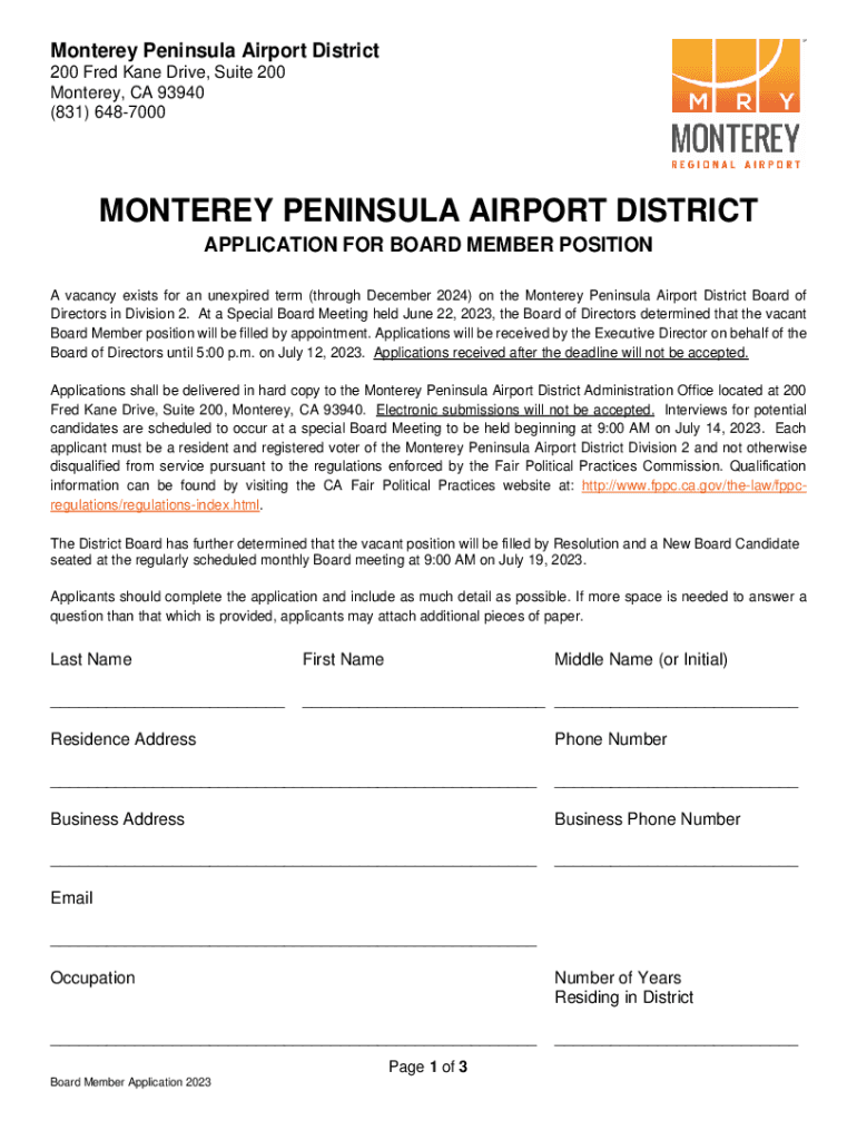 Monterey Peninsula Airport District 200 Fred Kane Drive, Suite 200 Monterey, CA 93940 (831) 6487000MONTEREY PENINSULA AIRPORT DISTRICT APPLICATION FOR BOARD MEMBER POSITION A vacancy exists for an