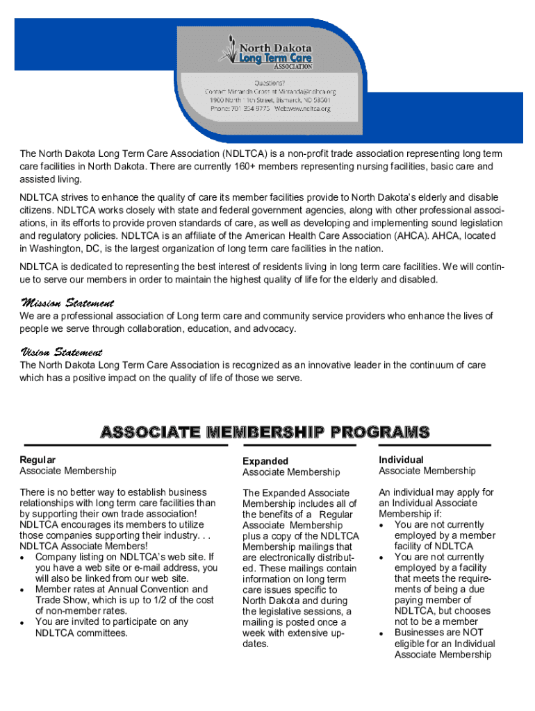The North Dakota Long Term Care Association (NDLA) is a nonprofit trade association representing long term care facilities in North Dakota. There are currently 160+ members representing nursing facilities,