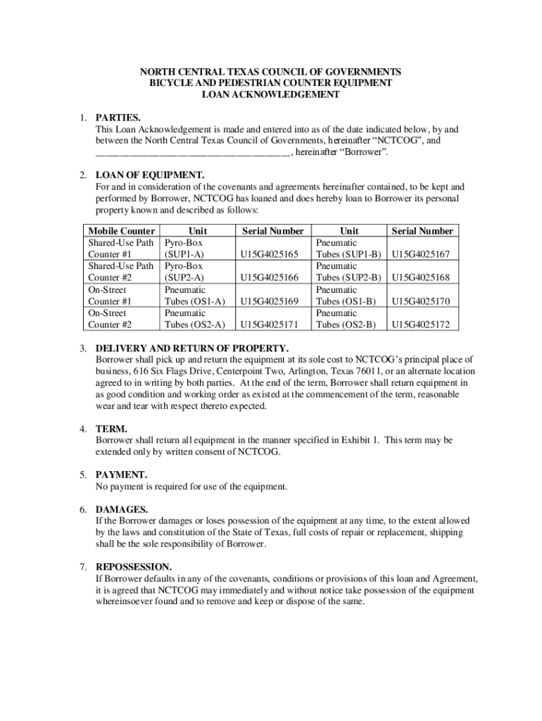 NORTH CENTRAL TEXAS COUNCIL OF GOVERNMENTS Bicycles AND PEDESTRIAN COUNTER EQUIPMENT LOAN ACKNOWLEDGEMENT 1. PARTIES. This Loan Acknowledgement is made and entered into as of the date indicated below,