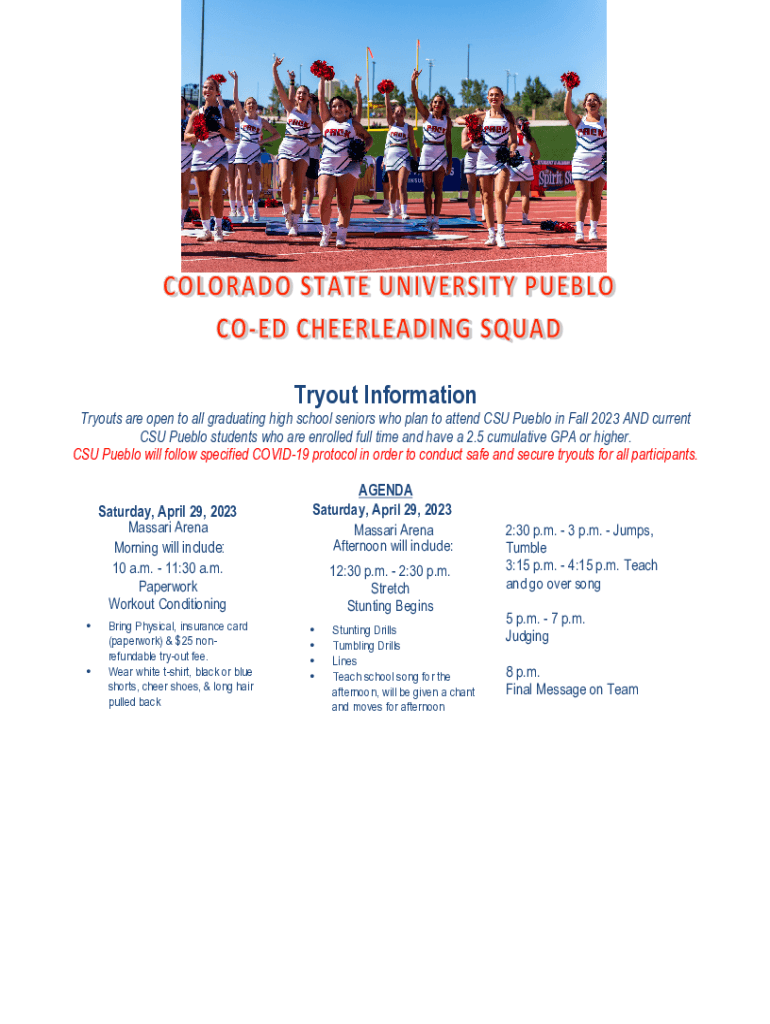 Tryout Information Tryouts are open to all graduating from high school seniors who plan to attend CSU Pueblo in Fall 2023 AND current CSU Pueblo students who are enrolled full time and have a 2.5