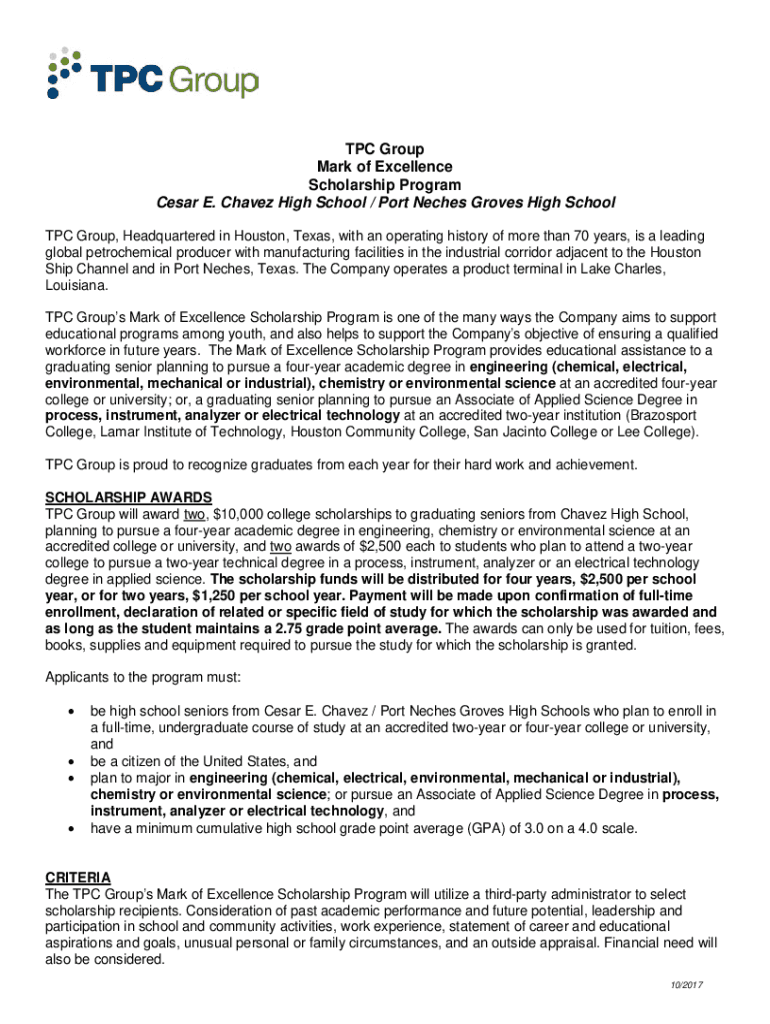 TPC Group Mark of Excellence Scholarship Program Cesar E. Chavez High School / Port Niches Groves High School TPC Group, Headquartered in Houston, Texas, with an operating history of more than 70