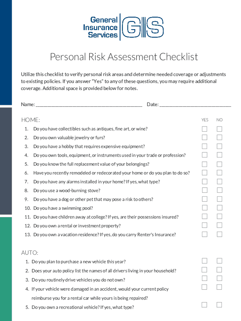 Personal Risk Assessment Checklist Utilize this checklist to verify personal risk areas and determine needed coverage or adjustments to existing policies. If you answer \” Yes\” to any of these