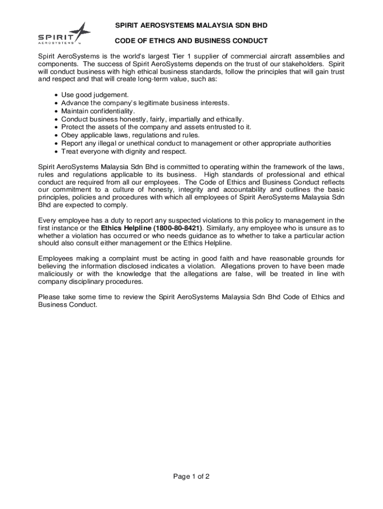 SPIRIT ECOSYSTEMS MALAYSIA SDN BHD CODE OF ETHICS AND BUSINESS CONDUCT Spirit Ecosystems is the world's the largest Tier 1 supplier of commercial aircraft assemblies and components. The success of