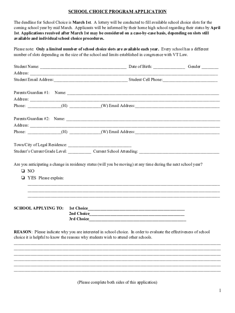 SCHOOL CHOICE PROGRAM APPLICATION The deadline for School Choice is March 1st. A lottery will be conducted to fill available school choice slots for the coming school year by mid-March. Applicants