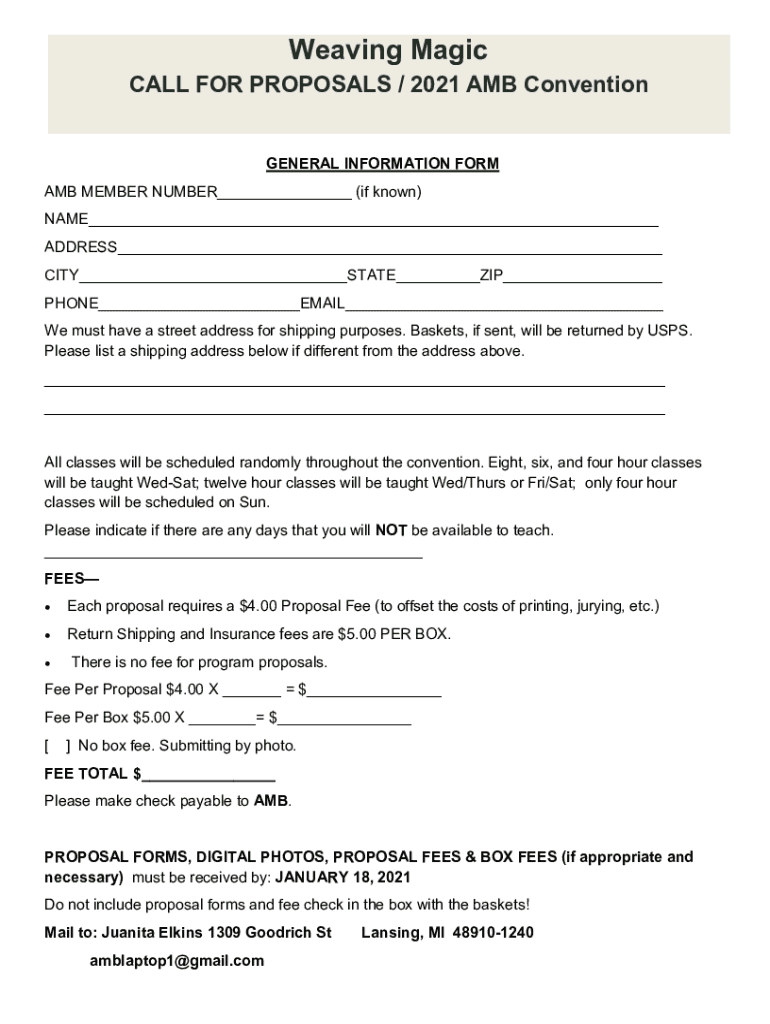 Weaving Magic CALL FOR PROPOSALS / 2021 AM Convention GENERAL INFORMATION FORM AM MEMBER NUMBER___ (if known) NAME___ ADDRESS___ CITY___STATE___ZIP___ PHONE___EMAIL___ We must have a street address