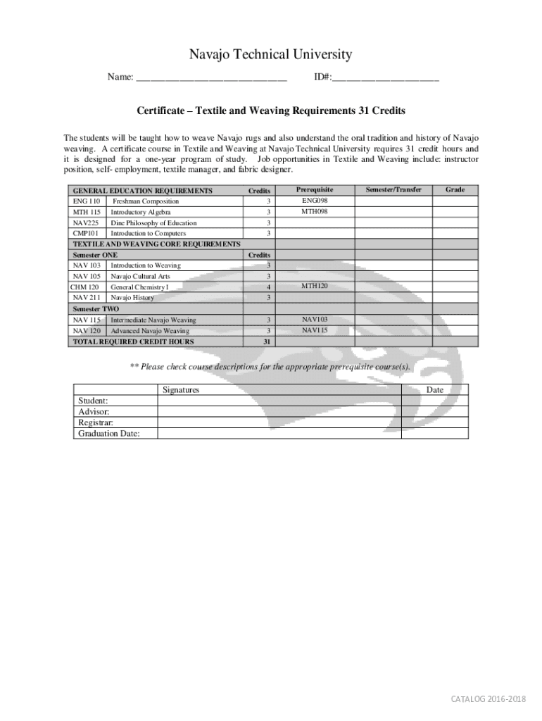 Navajo Technical University Name: ___ID#:___Certificate Textile and Weaving Requirements 31 Credits The students will be taught how to weave Navajo rugs and also understand the oral tradition and