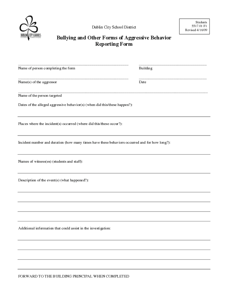 Students 5517.01 F1 Revised 4/16/09Dublin City School DistrictBullying and Other Forms of Aggressive Behavior Reporting Form___ Name of person completing the form___ Building___ Name(s) of the aggressor___