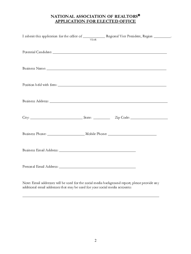 NATIONAL ASSOCIATION OF REALTORS APPLICATION FOR ELECTED OFFICE: REGIONAL VICE PRESIDENTAPPLICATIONS AND MATERIALS MUST BE SUBMITTED BETWEEN MARCH 1 AND JUNE 1 OF THE YEAR PRIOR TO THE MEETING OF