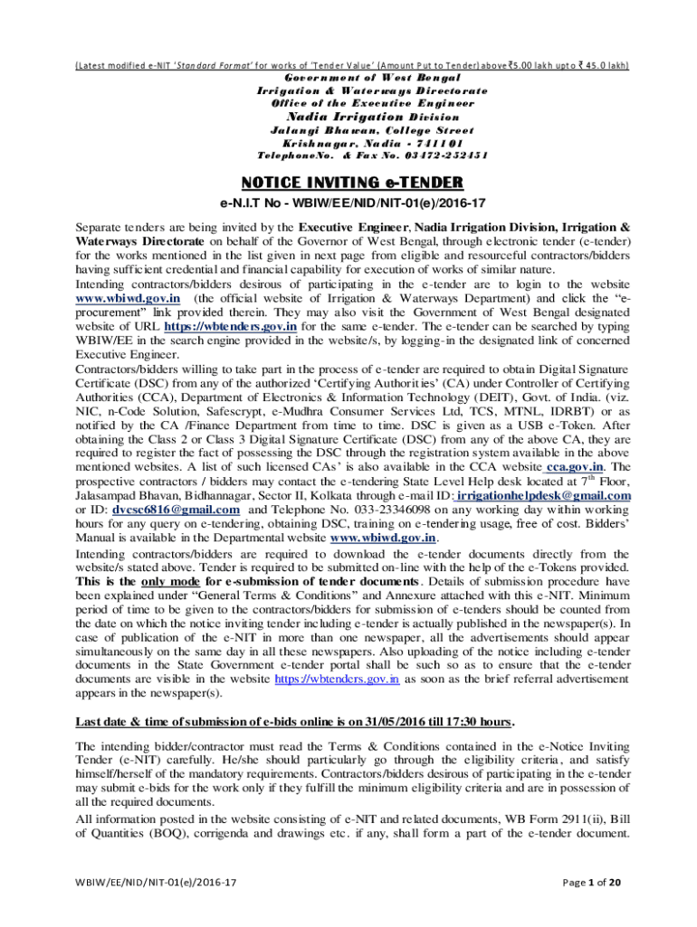 (Latest modified ENIT Standard For mat for works of Tend her Value (Amount Put to Ten her) above 5.00 lakh UPT o 45. 0 lakh)Gov her n m e NT of W est Be n gal