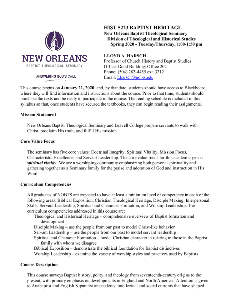 HIST 5223 BAPTIST HERITAGE New Orleans Baptist Theological Seminary Division of Theological and Historical Studies Spring 2020 Tuesday/Thursday, 1:001:50 pm LLOYD A. HARSH Professor of Church History