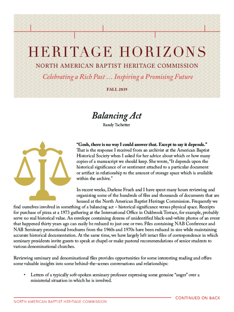 H ER TAG E H O RIO O N S NORTH AMERICAN BAP LIST HERITAGE COMMISSIONCelebrating a Rich Past Inspiring a Promising Future FALL 2019Balancing Act Randy TschetterGosh, there is no way I could answer