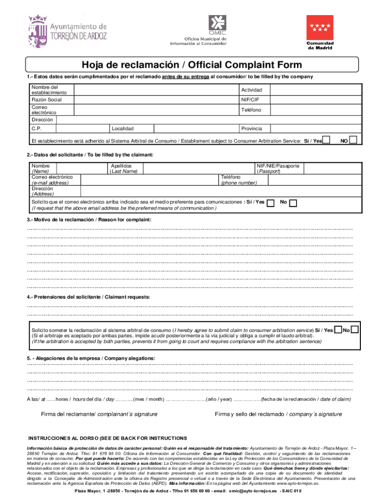Obtener el gratis Get Hoja De Reclamacin / Official Complaint Form
