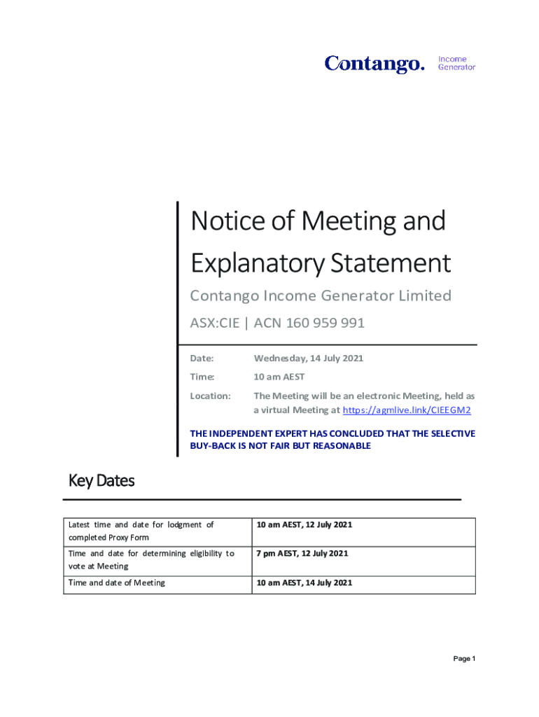 Notice of Meeting and Explanatory Statement Contango Income Generator Limited ASX:CIE | ACN 160 959 991 Date:Wednesday, 14 July 2021Time:10 am Restoration:The Meeting will be an electronic Meeting,