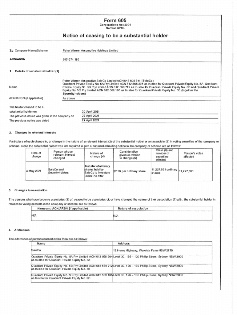 Form 605Corporations Act 2001 Section 671BNotice of ceasing to be a substantial holder To Company Name/Scheme Peter Warren Automotive Holdings Limited ACN/ARSN615 674 1851. Details of substantial