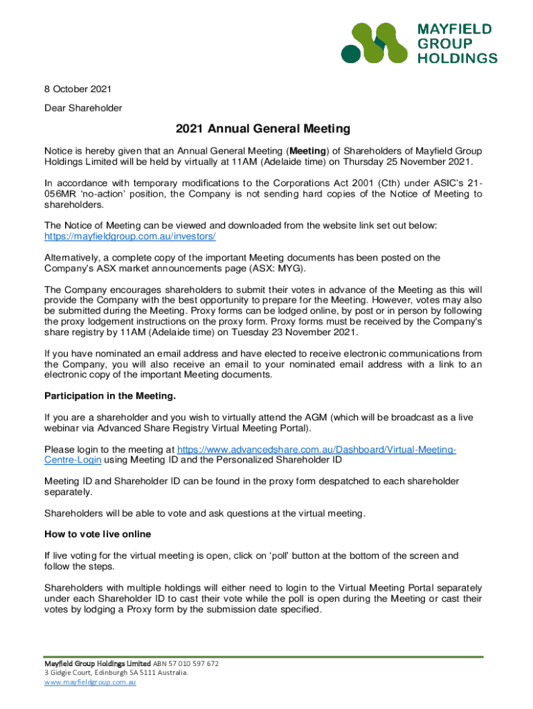 8 October 2021 Dear Shareholder2021 Annual General Meeting Notice is hereby given that an Annual General Meeting (Meeting) of Shareholders of Mayfield Group Holdings Limited will be held by virtually